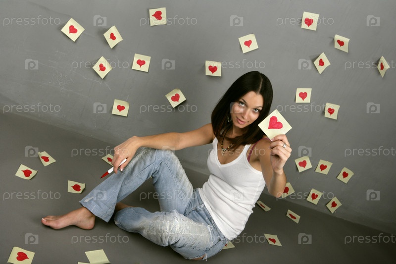 Молодая девушка расклеивает сердечки на стену