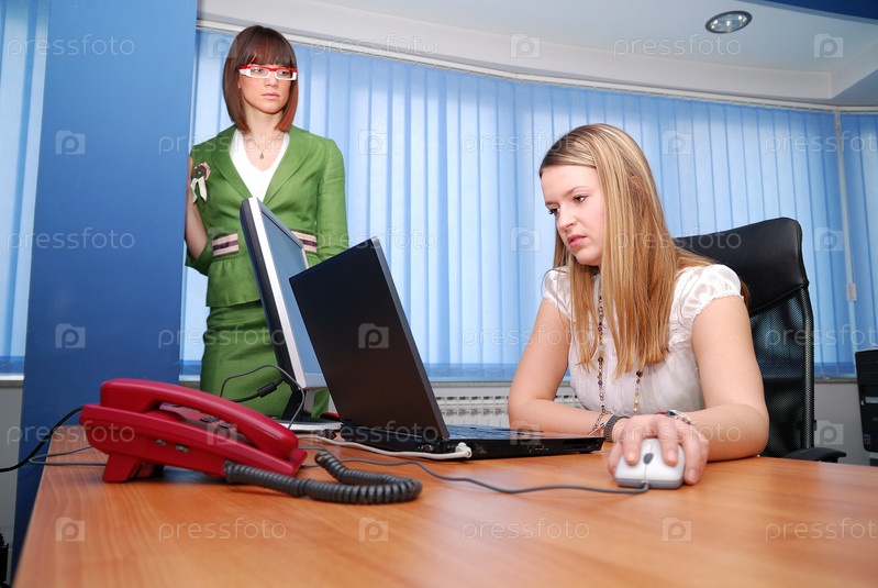 Две молодые деловые женщины работают за ноутбуком в кабинете