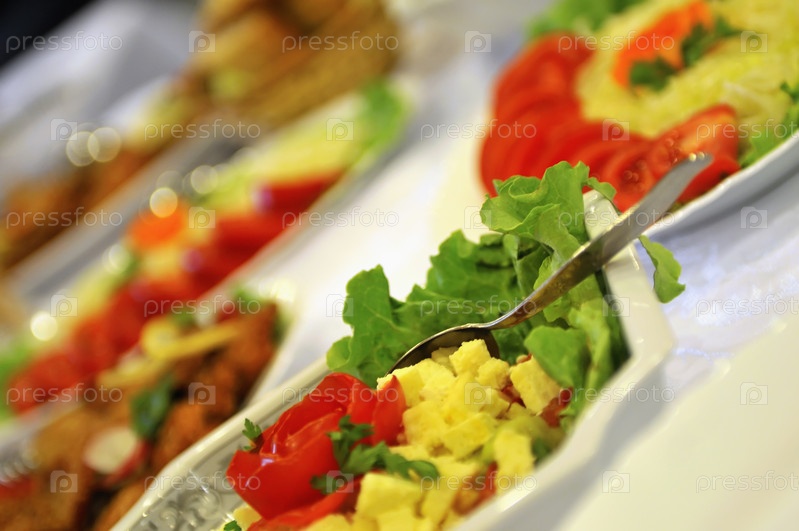 Различные закуски и салаты на столе