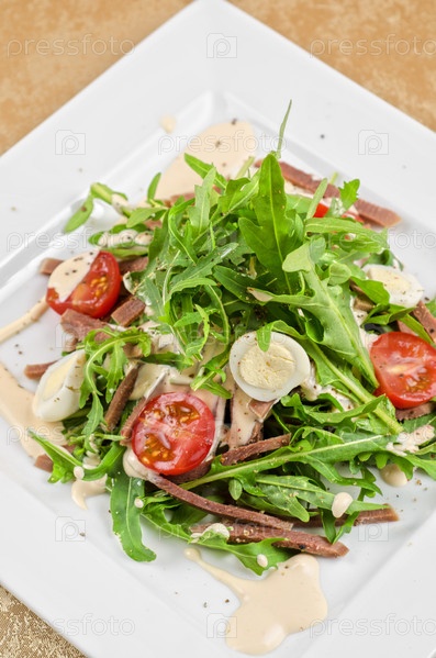 Салат из говяжьего языка с яйцами, рукколой, помидорами, специями и соусом