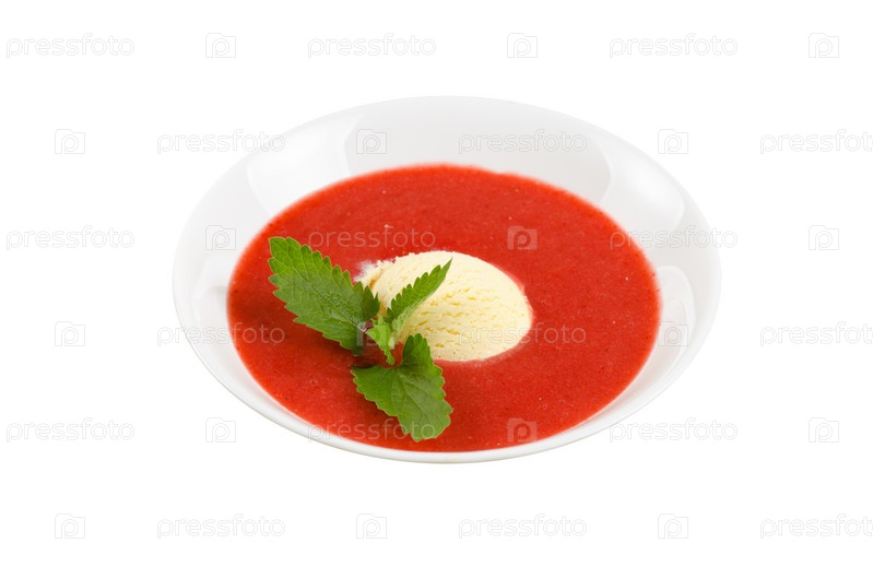 Клубничный суп с мороженым и мятой на белом фоне