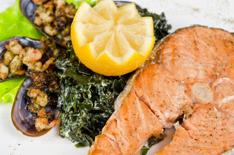 Стейк из лосося с мидиями, лимоном и киви