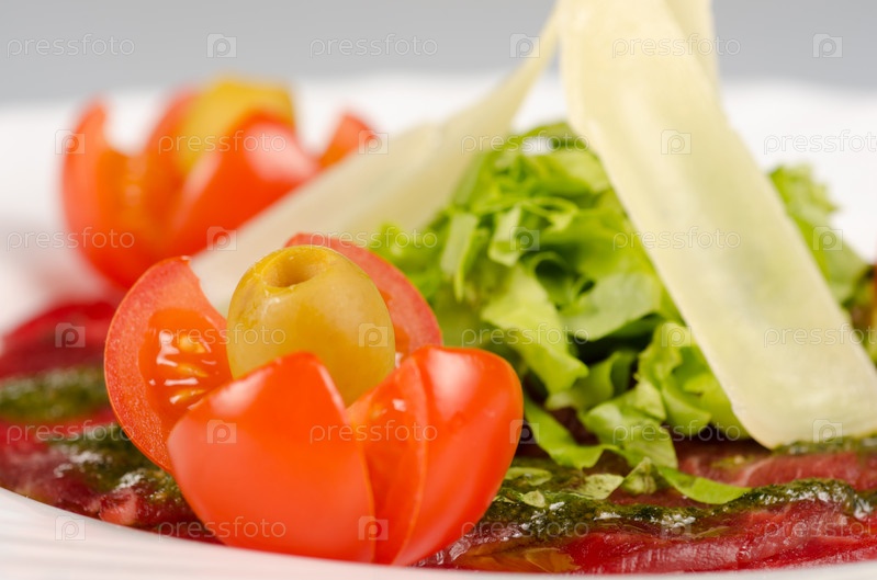 Карпаччо из говядины, пармезана, оливок, помидор и соуса песто