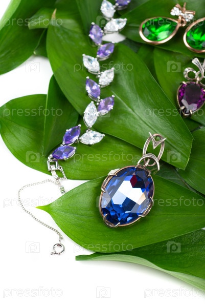 Ювелирные изделия с драгоценными камнями на зеленых листьях