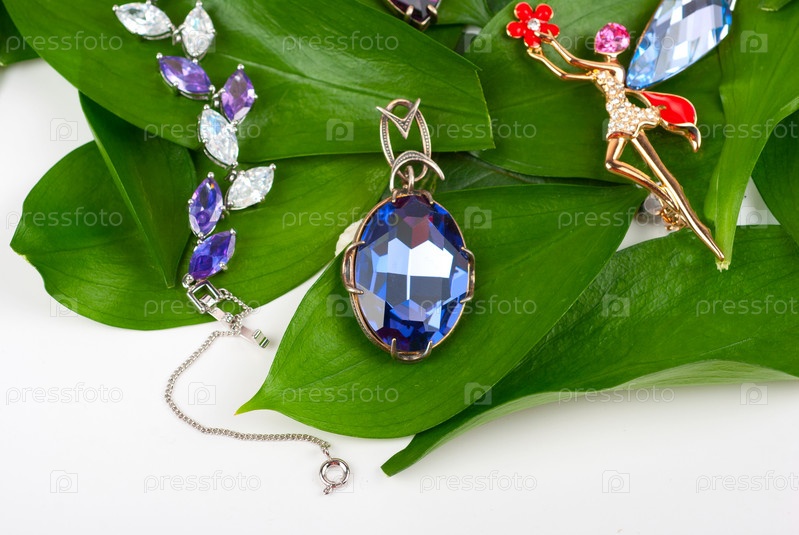 Ювелирные изделия с драгоценными камнями на зеленых листьях