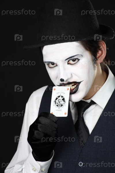 Клоун в белом гриме с картой в зубах
