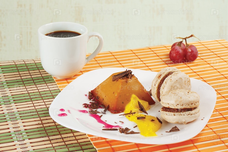Кофе, макаруны, карамельный пудинг и виноград на столе