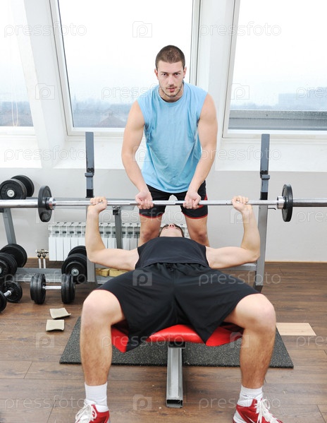 Молодой человек занимается в спортзале с тренером