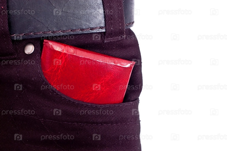 Красные документы в кармане джинсов, изолированные на белом