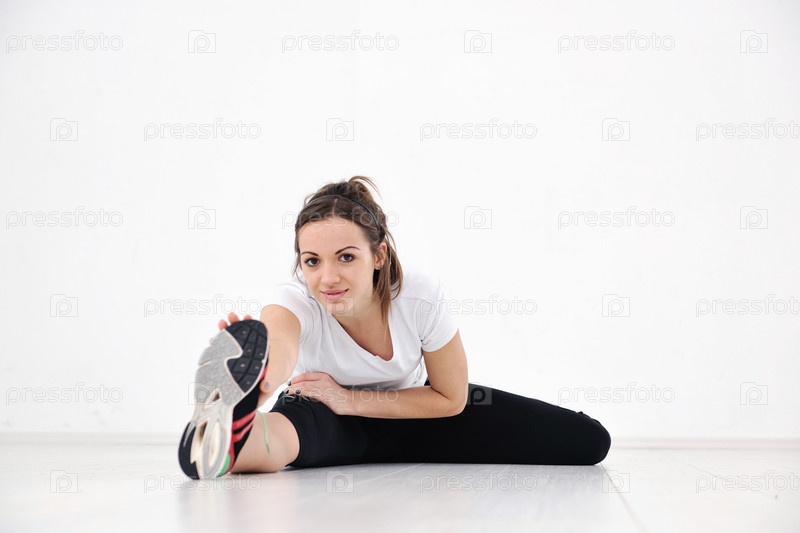 Красивая девушка делает растяжку на белом фоне