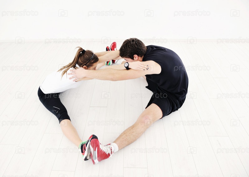 Молодые люди занимаются растяжкой на белом фоне