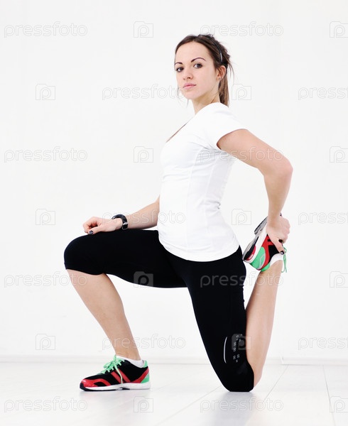 Красивая девушка делает растяжку на белом фоне