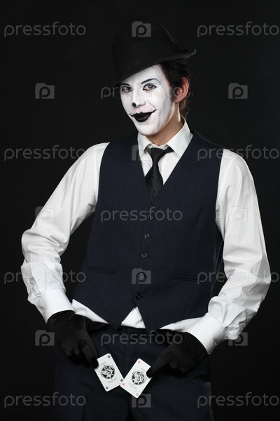 Портрет пантомима в костюме с картами в руках