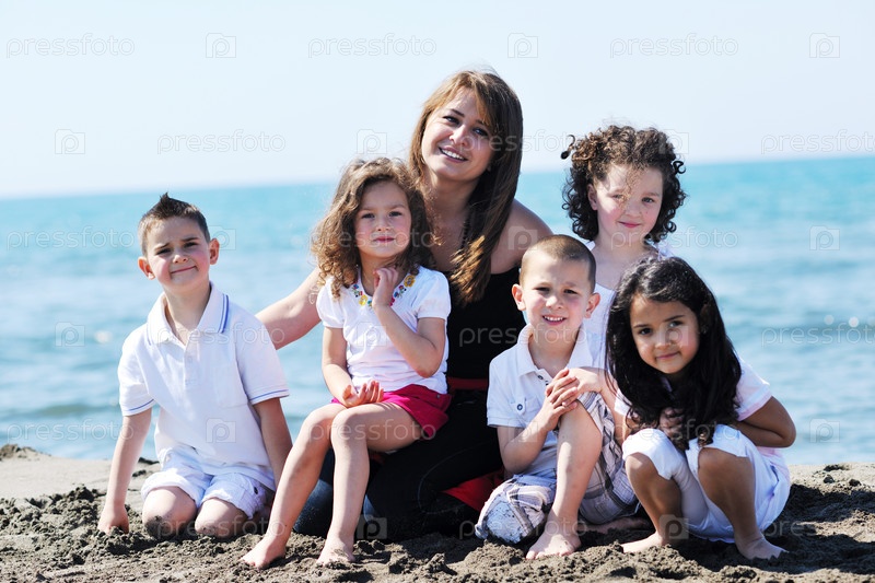 Счастливые дети с молодой женщиной на пляже