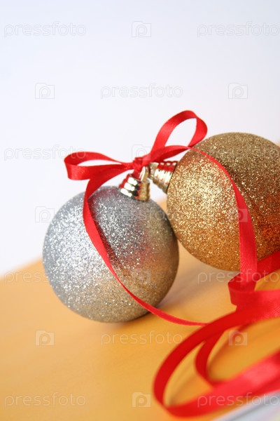 Новогодние шарики, связанные красной лентой