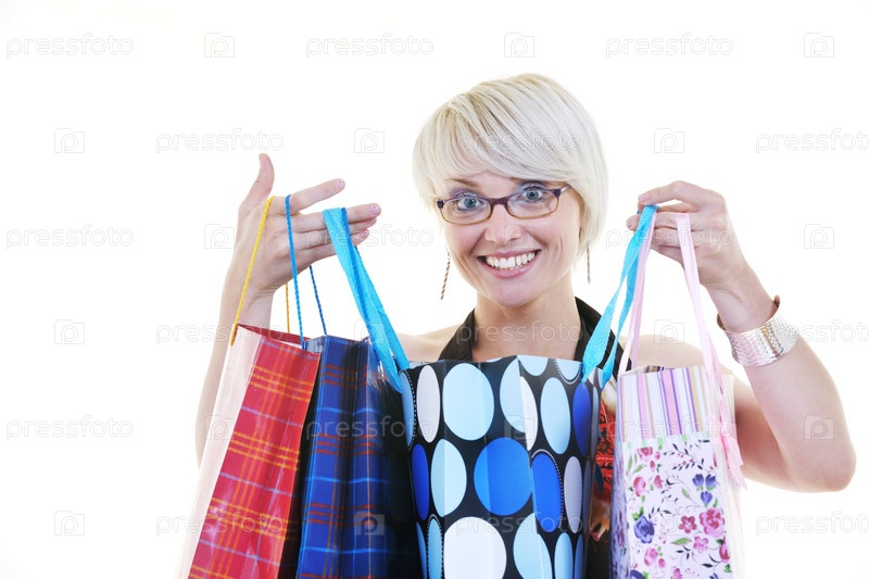 Счастливая женщина с покупками на белом фоне
