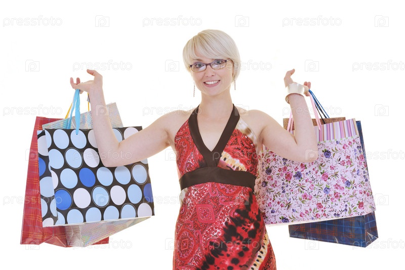 Счастливая молодая женщина с покупками, изолировано на белом фоне