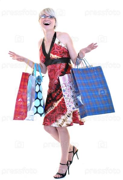 Счастливая молодая женщина с покупками, изолировано на белом фоне