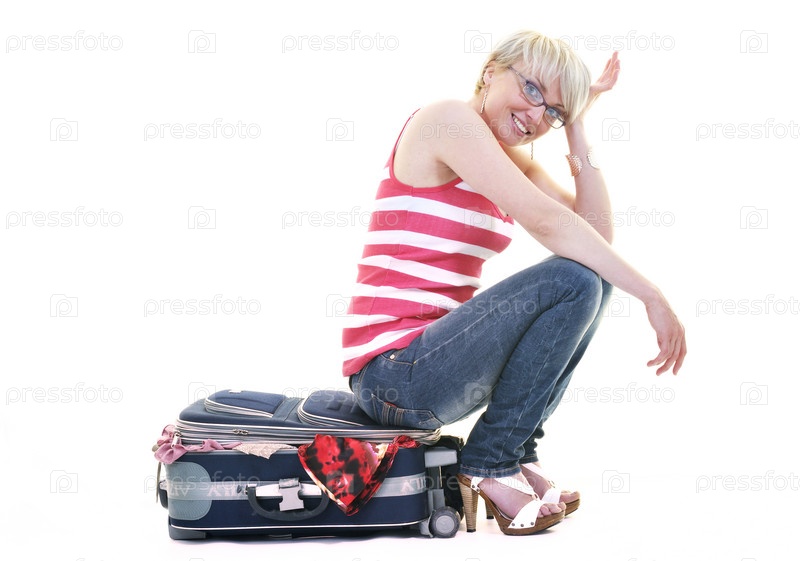 Туристка упаковывает чемодан, изолировано на белом фоне
