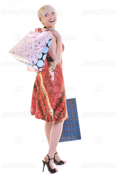 Счастливая молодая женщина с бумажными пакетами в руках на белом фоне