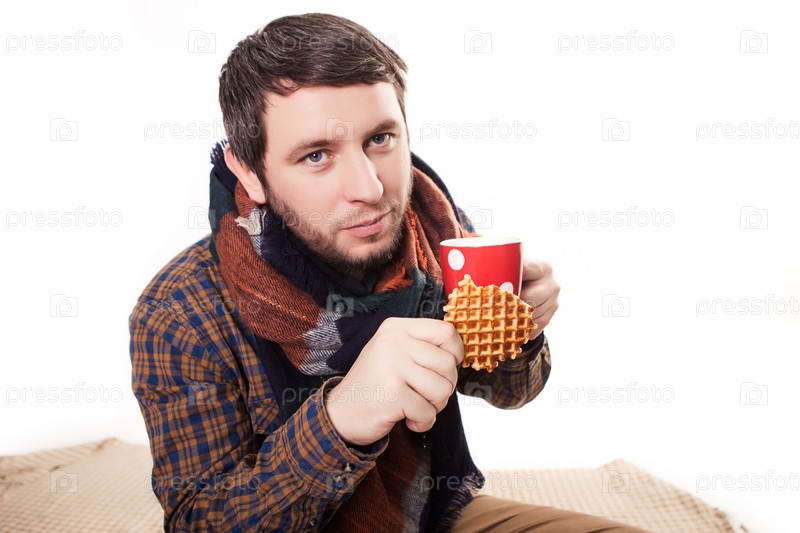 Счастливый человек с кофе и вафлями