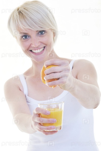 Молодая женщина делает свежевыжатый апельсиновый сок на белом фоне