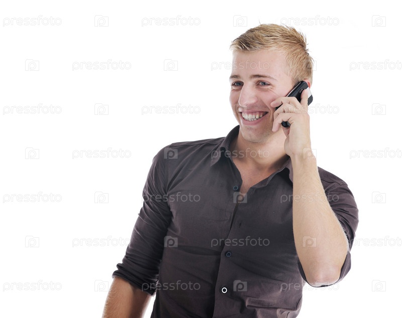 Стильно одетый молодой человек с мобильным телефоном на белом фоне