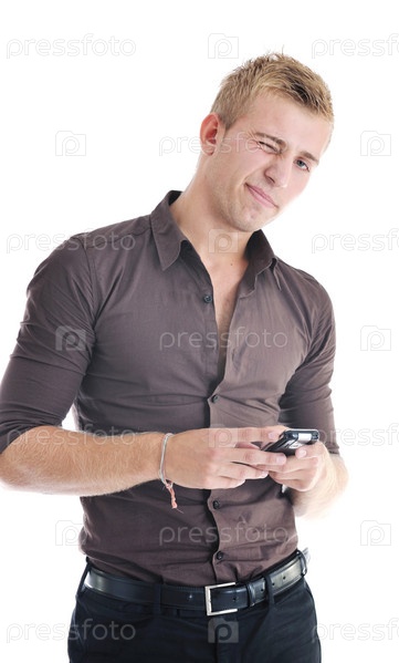 Стильно одетый молодой человек с мобильным телефоном на белом фоне