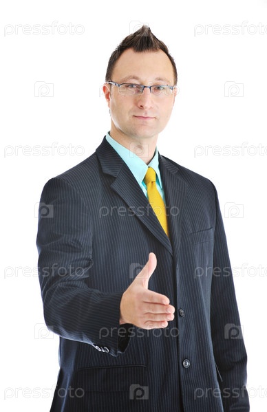 Счастливый молодой бизнесмен протягивает руку для рукопожатия на белом фоне