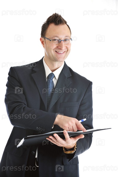 Счастливый молодой бизнесмен, изолировано на белом фоне