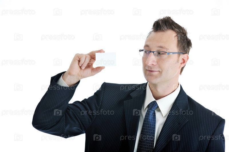 Портрет молодого бизнесмена с пустой визитной карточкой на белом фоне