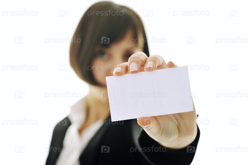 Портрет деловой женщины с визиткой в руке на белом фоне