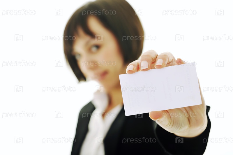 Портрет деловой женщины с визиткой в руке на белом фоне