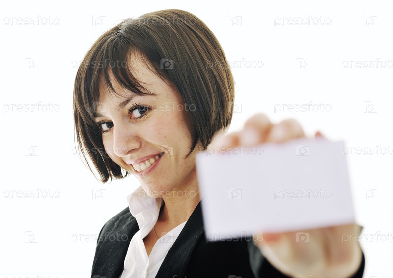 Портрет деловой женщины с визиткой в руке на белом фоне