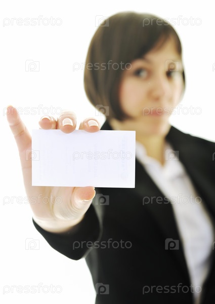 Портрет деловой женщины с визиткой в руке на белом фоне