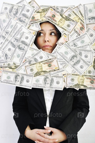 Счастливая молодая деловая женщина с деньгами, изолирована на белом фоне
