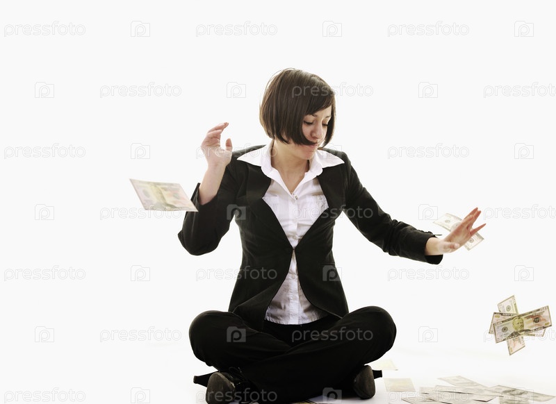 Счастливая молодая деловая женщина с деньгами, изолирована на белом фоне