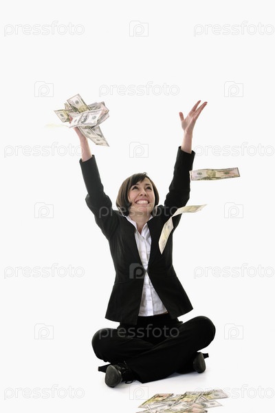 Счастливая молодая деловая женщина с деньгами, изолирована на белом фоне