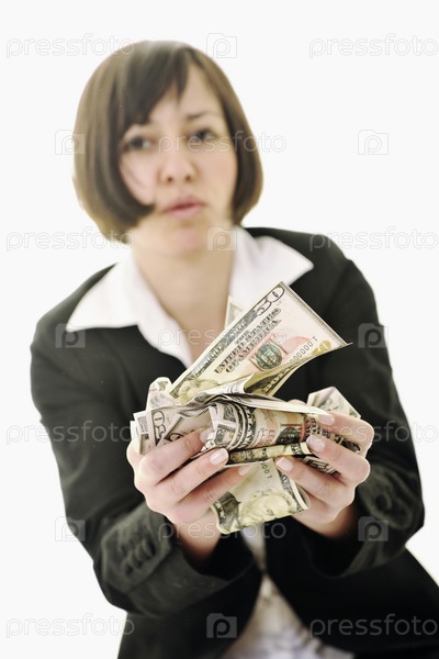 Счастливая молодая деловая женщина с деньгами, изолирована на белом фоне