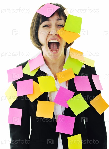 Молодая деловая женщина со стикерами на одежде на белом фоне