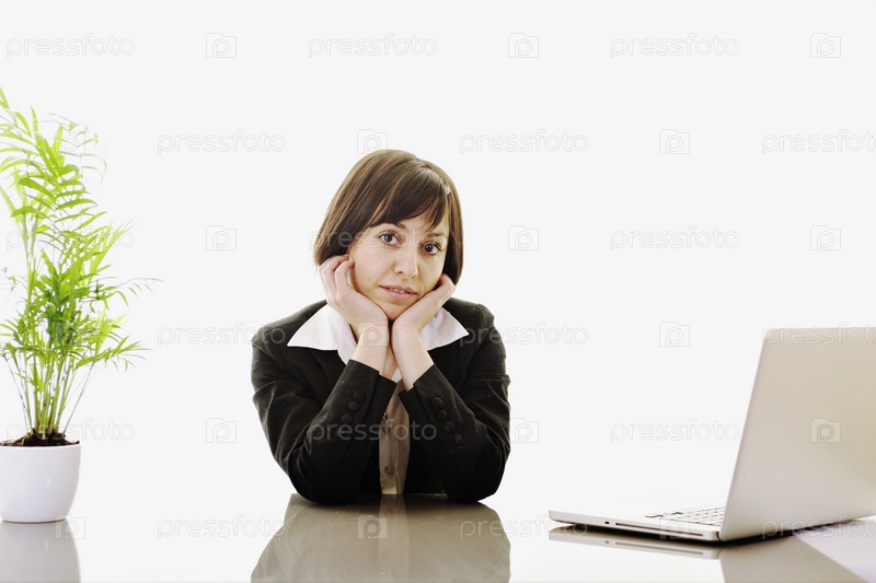 Молодая бизнес-леди с ноутбуком, изолировано на белом фоне