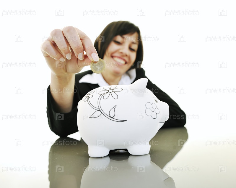 Молодая деловая женщина кладет евро в копилку, изолировано на белом фоне