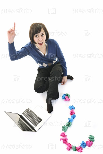 Молодая красивая студентка с ноутбуком и вопросом из скомканных листов бумаги