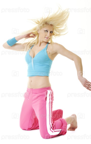 Красивая блондинка занимается фитнесом на белом фоне