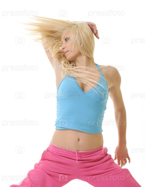 Молодая красивая женщина танцует на белом фоне