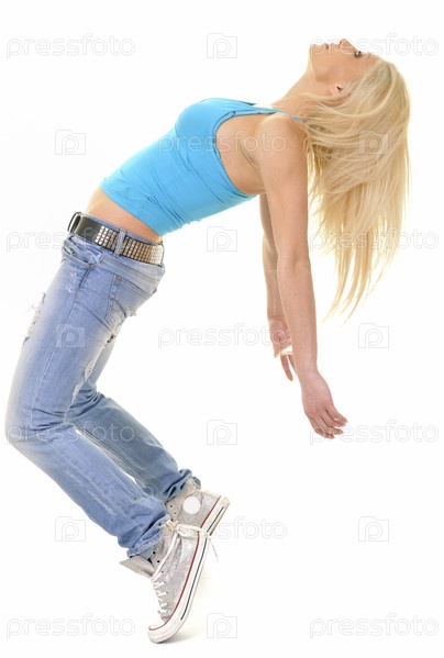 Молодая красивая женщина танцует на белом фоне