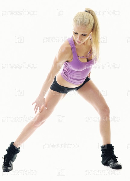 Молодая красивая женщина танцует на белом фоне