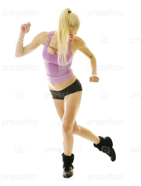 Молодая красивая женщина танцует на белом фоне
