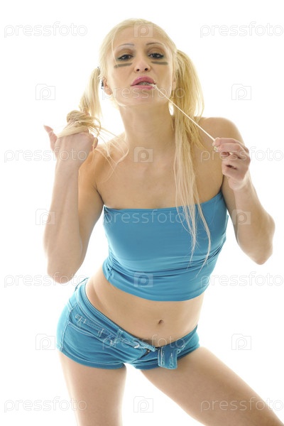 Портрет красивой блондинки в спортивной одежде на белом фоне