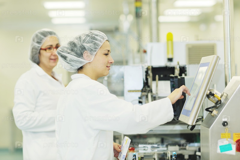 Работницы в белых халатах на аптечном складе